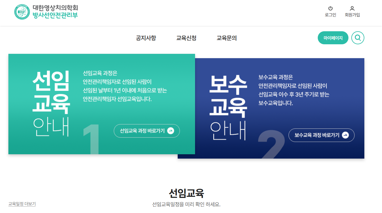 대한영상치의학회 진단용방사선 안전관리책임자교육은 안전관리자가 반드시 받아야 하는 선임교육과 보수교육을 제공하는 사이트입니다. 해당 사이트 바로가기는 다음과 같습니다.