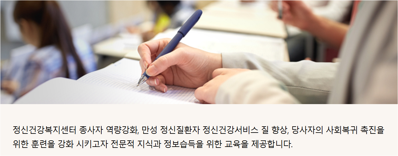 정신요양시설 종사자교육은 정신요양시설 종사자들의 직무 역량강화 및 전문적인 지식 제공, 대처 능력 향상을 위해 보건복지부 국립정신건강센터에서 제공하는 교육입니다. 종사자교육 바로가기는 다음과 같습니다.