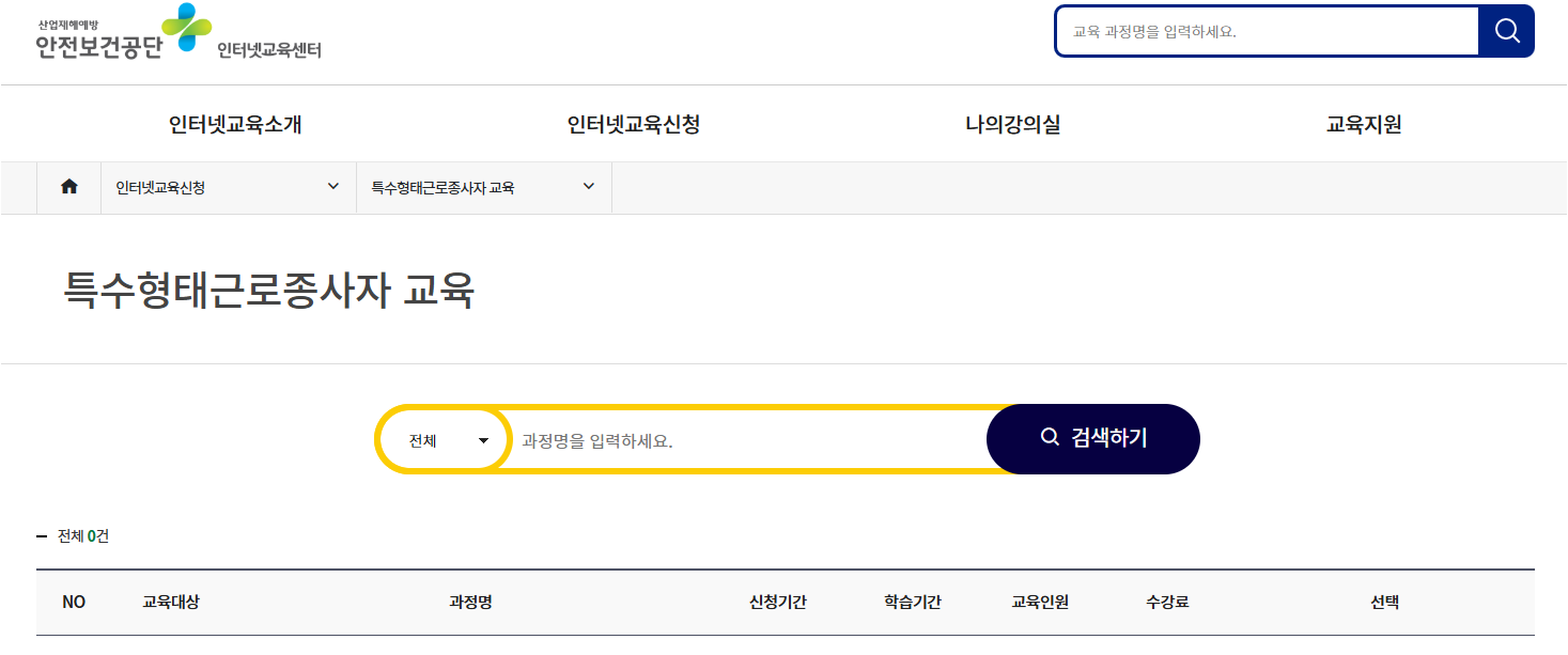 특수형태 근로종사자 안전교육은 안전보건공단 인터넷교육센터에서 제공하는 교육으로 운수업, 건설업, 배달업, 보험설계사 등과 같은 특수형태 종사자를 위한 법정의무교육입니다. 해당 사이트 바로가기는 다음과 같습니다.