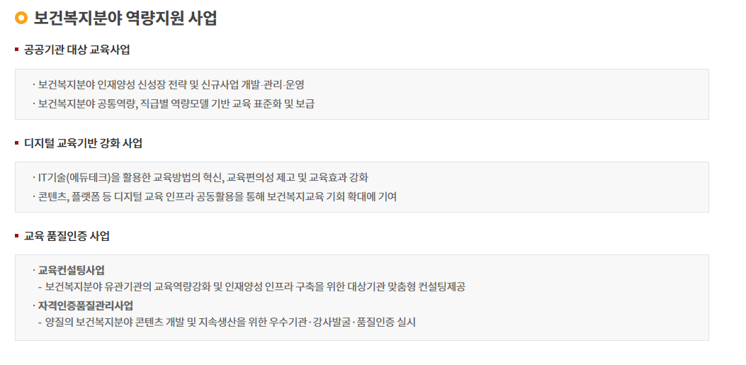 한국보건복지인재원(KOHI)은 보건복지 분야의 전문 인력을 양성하고 역량을 강화하는 교육 기관입니다. 보건, 복지, 의료, 돌봄 등 다양한 분야의 정책과 실무 교육을 통해 국민 건강과 복지를 향상시키는 데 기여하고 있습니다.