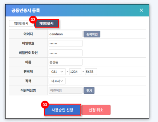 기본 정보 입력: 어린이집 정보 및 담당자 정보를 입력합니다.