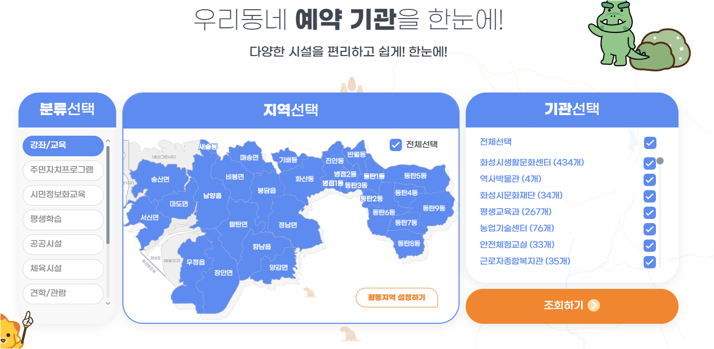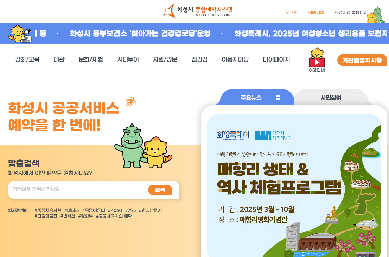 화성시 통합예약시스템은 화성시에서 제공하는 공공시설과 프로그램을 한 곳에서 예약할 수 있는 온라인 플랫폼입니다. 복잡했던 개별 시설 예약 과정을 통합해 사용자가 하나의 사이트에서 간편하게 원하는 시설을 예약할 수 있도록 설계되었습니다. 주민자치센터 프로그램, 체육시설, 문화공연 및 각종 교육 프로그램 등을 이 시스템을 통해 예약할 수 있습니다.