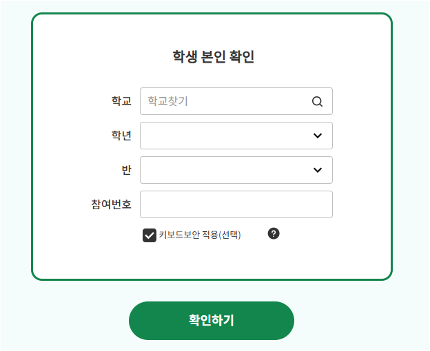 학생의 이름, 생년월일, 학년, 반 등 인적 사항을 입력하고 본인 확인을 진행합니다. 이때, 학교에서 제공한 '본인확인번호'를 입력해야 할 수 있으므로 사전에 확인하시기 바랍니다.