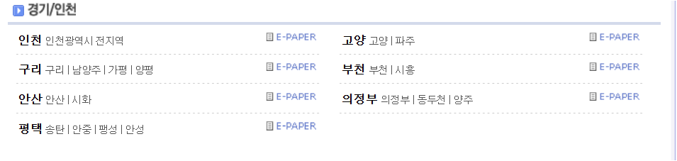 원하는 지역(예: 서울, 경기남부, 부산 등)을 클릭하면 해당 지역의 종이신문 PDF 혹은 뷰어가 실행됩니다. - 지면 넘기기 / 확대 보기 기능 활용