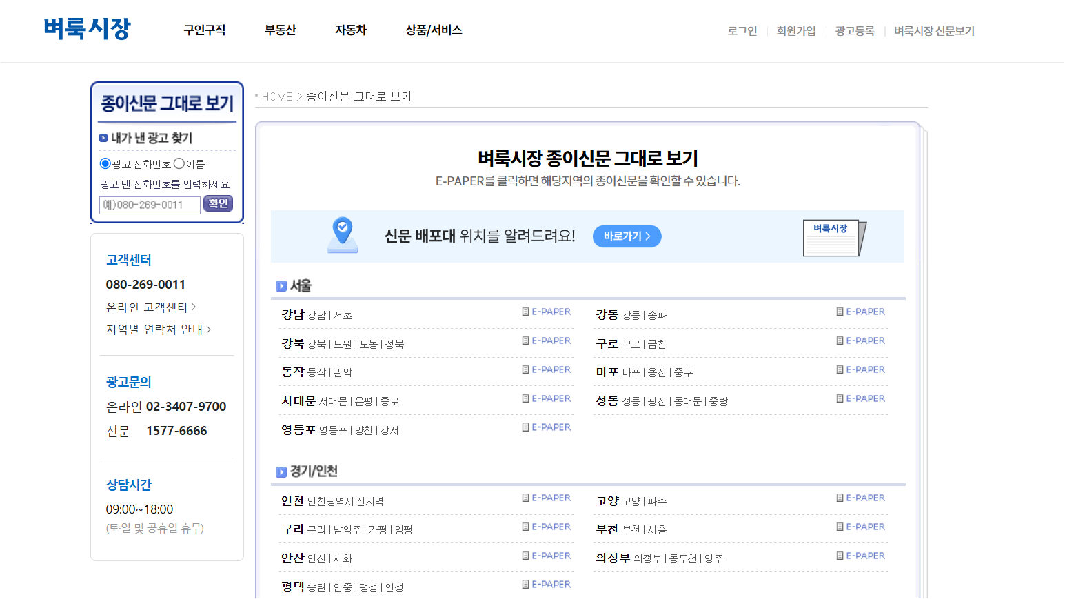 ‘종이신문 그대로 보기’는 말 그대로 오프라인에서 받아보던 벼룩시장 종이신문의 형식을 온라인에서도 동일하게 볼 수 있도록 구현한 서비스입니다. 신문지면 형태 그대로 스캔하거나 디지털화하여 제공하는 방식으로, 종이신문을 한 장씩 넘기듯 웹 상에서도 열람이 가능하다는 장점이 있습니다. 특히 지역별 지면 분리도 그대로 유지되기 때문에, 서울, 인천, 경기, 부산 등 각 지역의 신문판을 손쉽게 찾아볼 수 있습니다.