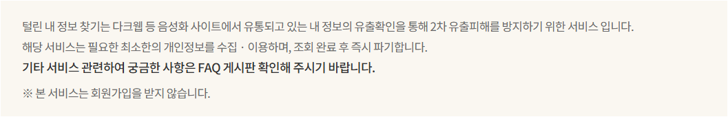이 서비스는 불법 유출된 정보가 다크웹이나 일반 유출 사이트에 올라왔는지를 분석하여, 유출이 의심되는 경우 사용자에게 안내해주는 구조로 되어 있습니다.