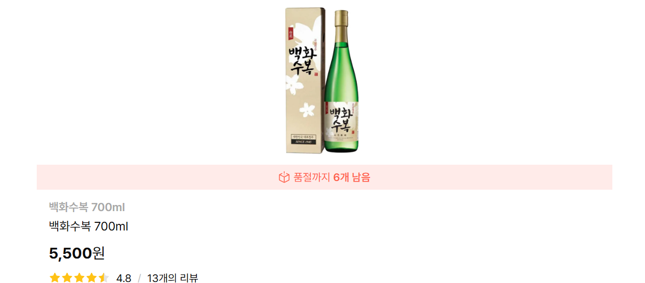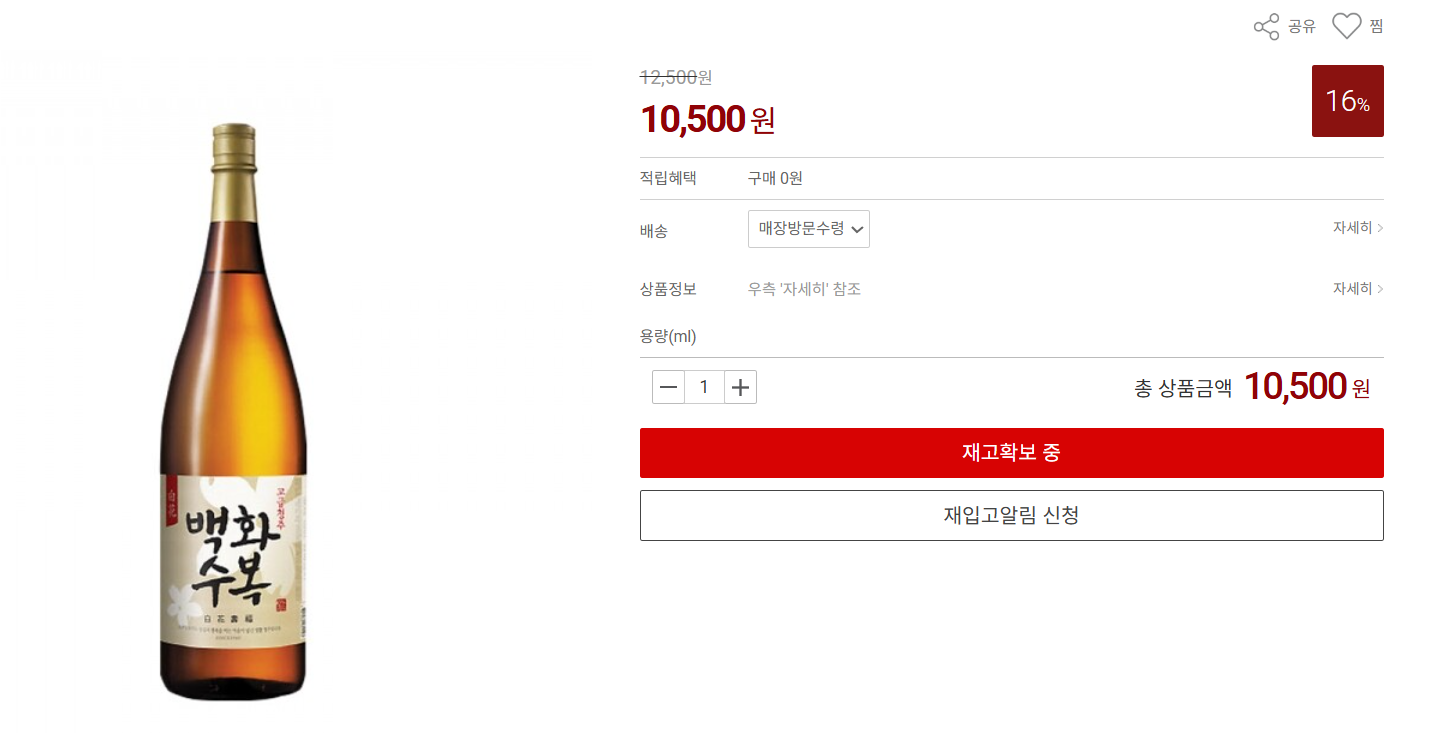 백화수복은 일부 주류전문 쇼핑몰에서 판매중인데요. 온라인몰 데일리샷에서 판매중인 백화수복 가격은 700ml 기준 5,500원입니다. 또한 주류사이트 더초이스에서는 1800ml 기준 10,500원에 판매중입니다.