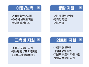 복지로 홈페이지는 아동 자립수당, 청년내일저축계좌, 폭력피해여성 주거지원 사업, 연장형 보육료 지원, 아이돌봄 서비스, 다문화가족 지원사업등을 제공하고 있습니다. 한번 가입으로 국가에