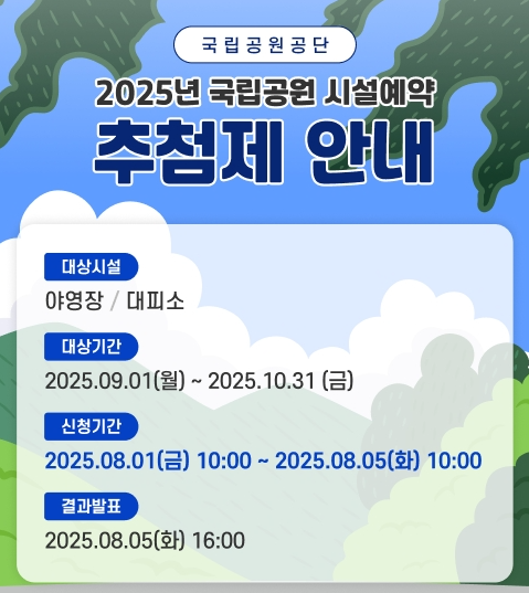 국립공원 예약시스템은 국립공원 내 숙박, 야영장, 대피소, 탐방 프로그램 등을 사전에 온라인으로 예약할 수 있는 서비스입니다. 무분별한 이용을 방지하고 쾌적한 탐방 환경을 제공하기 위해 시행되고 있으며, 누구나 회원가입 후 편리하게 사용할 수 있습니다.