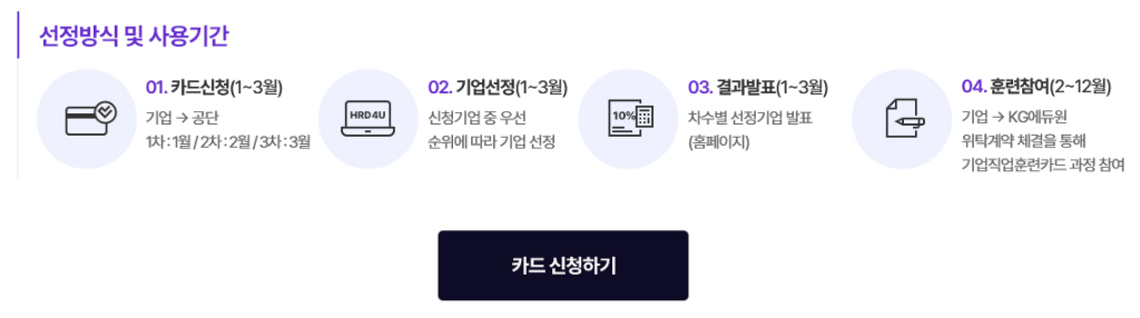 KG에듀원을 통해 훈련을 신청하려면 우선 기업훈련카드 발급이 필요합니다. 이는 HRD-Net 기업훈련카드 페이지를 통해 온라인으로 신청할 수 있으며, 신청 후 승인을 받으면 카드 예산이 부여됩니다.