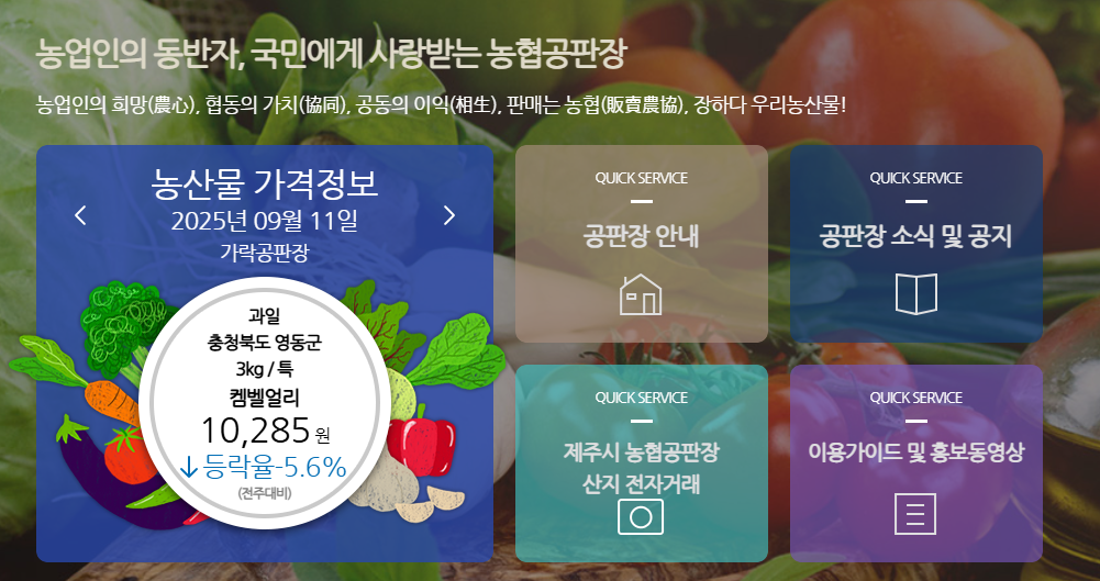 농협공판장 인터넷 통합거래시스템은 전국 주요 농협공판장에서 이루어지는 거래를 하나의 플랫폼으로 통합해 온라인으로 관리하고, 실시간으로 정보를 제공합니다. 해당 사이트 바로가기는 다음과 같습니다.