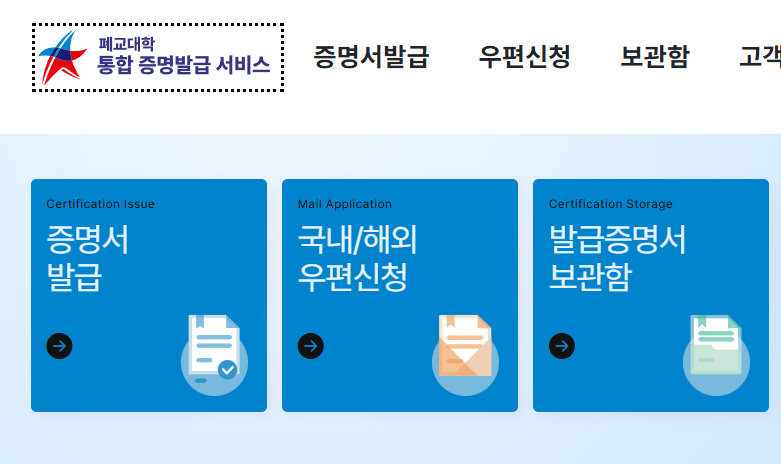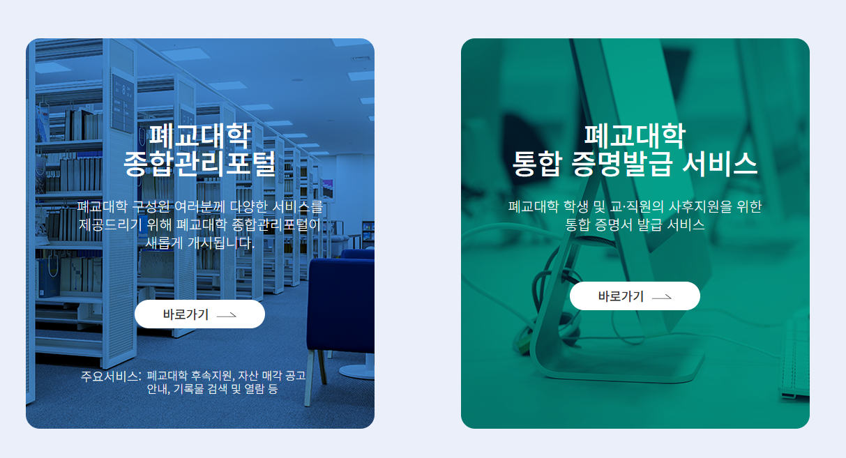 이 서비스는 폐교된 대학의 졸업생이 졸업증명서, 성적증명서, 수료증명서 등을 발급받을 수 있도록 마련된 시스템입니다. 기존에는 폐교된 학교의 서류를 발급받기 위해 담당 보관기관에 직접 문의해야 했지만, 지금은 통합 포털을 통해 온라인으로 신청하고 출력할 수 있어 훨씬 간편해졌습니다.