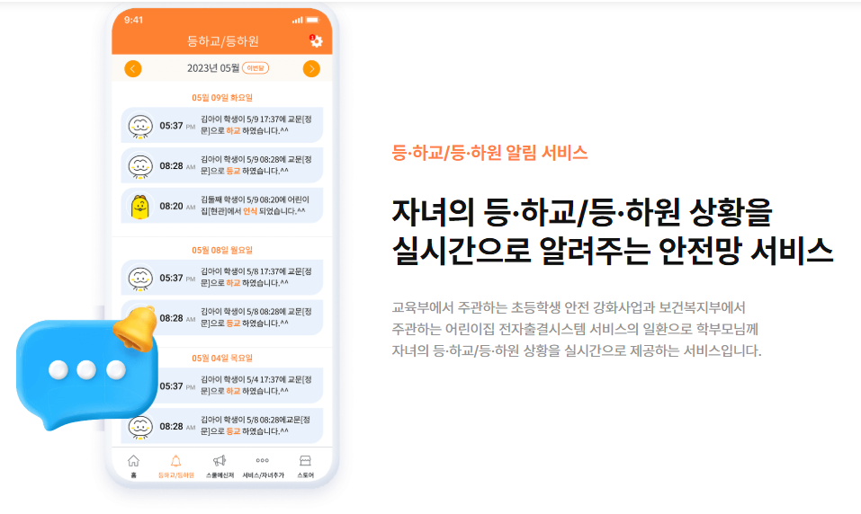 해당 서비스는 기관이 먼저 도입해야 하며, 학부모는 아이알리미 앱을 설치한 뒤 기관에서 제공하는 코드와 자녀 정보를 입력해 연동합니다. 이후 알림 권한을 허용하면 등하원 상황을 실시간으로 확인할 수 있습니다.
