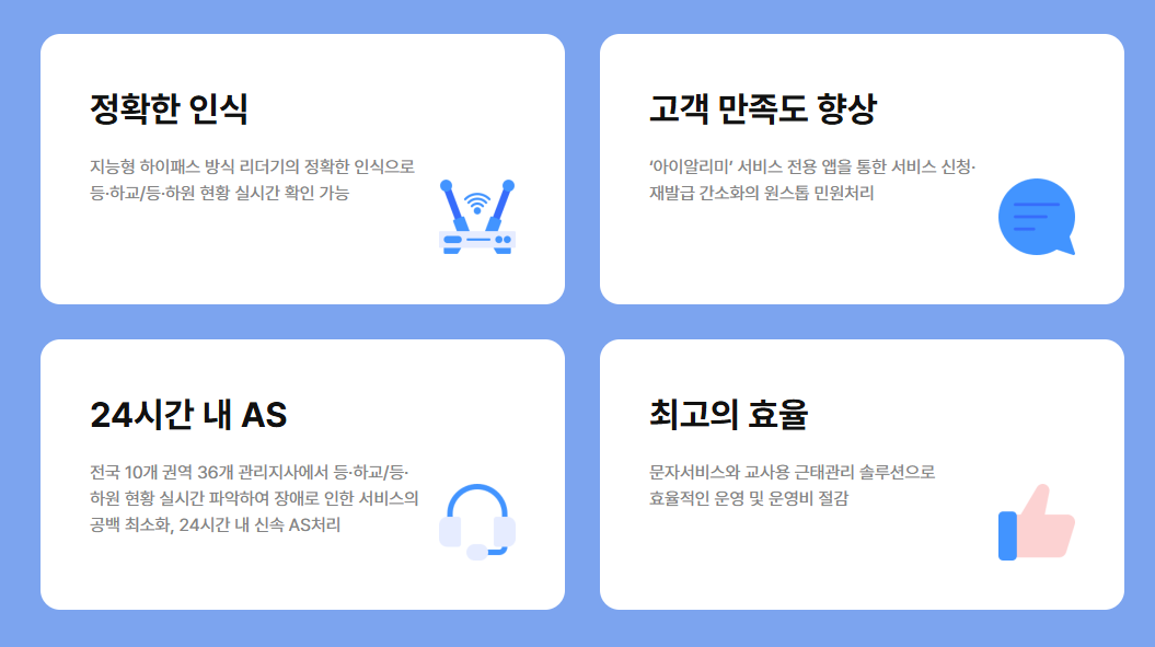 JT자동전자출결은 어린이집과 학교에서 원아 및 학생들의 등하원 시간을 자동으로 기록하고 관리할 수 있는 전자출결 시스템입니다. 여기에 더해 아이알리미는 학부모에게 자녀의 출결 상황을 실시간으로 알려주는 앱으로, 등하원 알림은 물론 공지사항과 식단표 같은 생활 정보까지 함께 제공해 가정과 기관 간 소통을 원활하게 해줍니다.