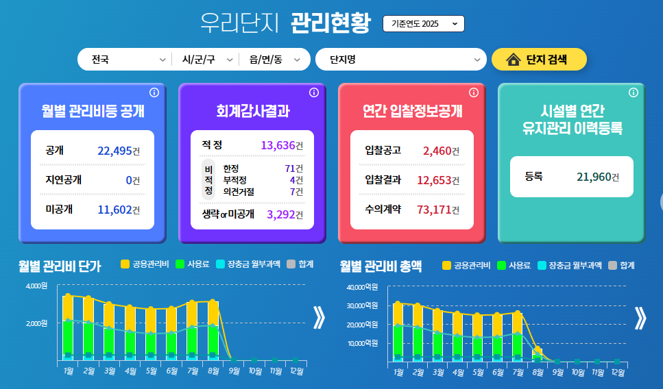 홈페이지에서는 단지 기본정보부터 관리비 내역, 회계감사 결과, 입찰공고, 유지관리 이력까지 한눈에 확인할 수 있습니다. 단지별 관리비는 월별로 세부 항목이 공개되며, 공용관리비, 개별사용료, 장기수선충당금 등으로 구분됩니다. 입주민들은 이를 기반으로 다른 단지와 비교해 과도한 지출이 있는지 확인할 수 있고, 단지 내 논의를 위한 객관적인 자료로 활용할 수 있습니다.