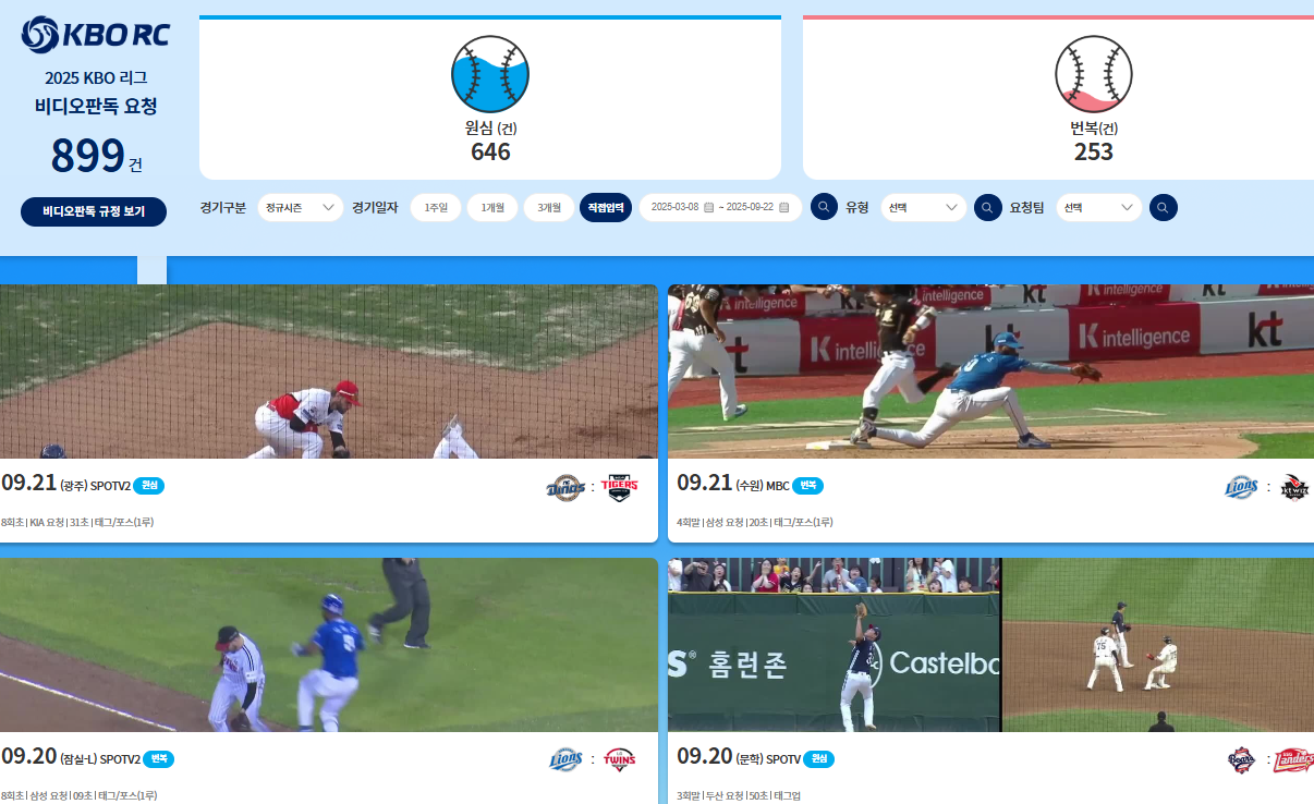KBO 비디오판독센터는 경기 중 심판이 내린 판정 중 의문이 있을 경우 요청에 따라 영상을 통해 판정의 정확성을 재검토하는 시스템입니다. KBO가 설치한 전용 카메라 영상을 활용해 판독합니다.