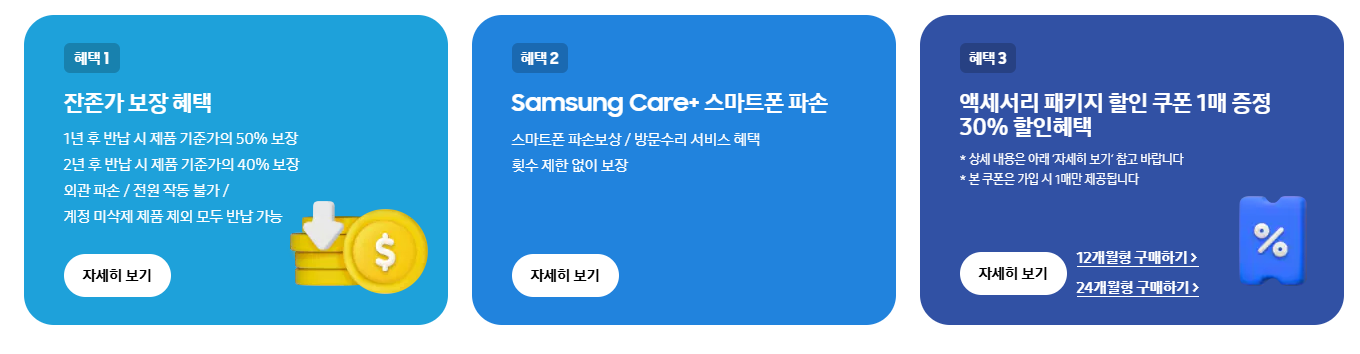 이 프로그램은 최신 갤럭시 S 시리즈와 Z 시리즈를 중심으로 제공되며, 일정 금액의 월 이용료를 납부하면서 기기를 사용하고, 일정 기간 이후에는 잔존가 보장 혜택을 통해 새 기기로 교체할 수 있는 기회를 제공합니다. 단순히 제품을 소유하는 방식에서 벗어나, 관리와 혜택을 아우르는 이용 경험을 원하는 사용자라면 충분히 고려할 만합니다.