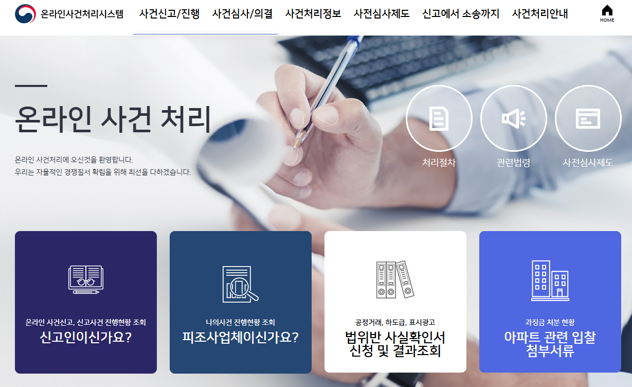 공정거래위원회 사건처리 시스템은 온라인으로 불공정행위나 거래 관련 문제를 신고·접수하고 처리 과정을 확인할 수 있도록 구성된 웹 서비스입니다. 신고부터 조사, 심의, 결과 확인까지 한 곳에서 진행할 수 있어 효율적인 민원 처리가 가능합니다.