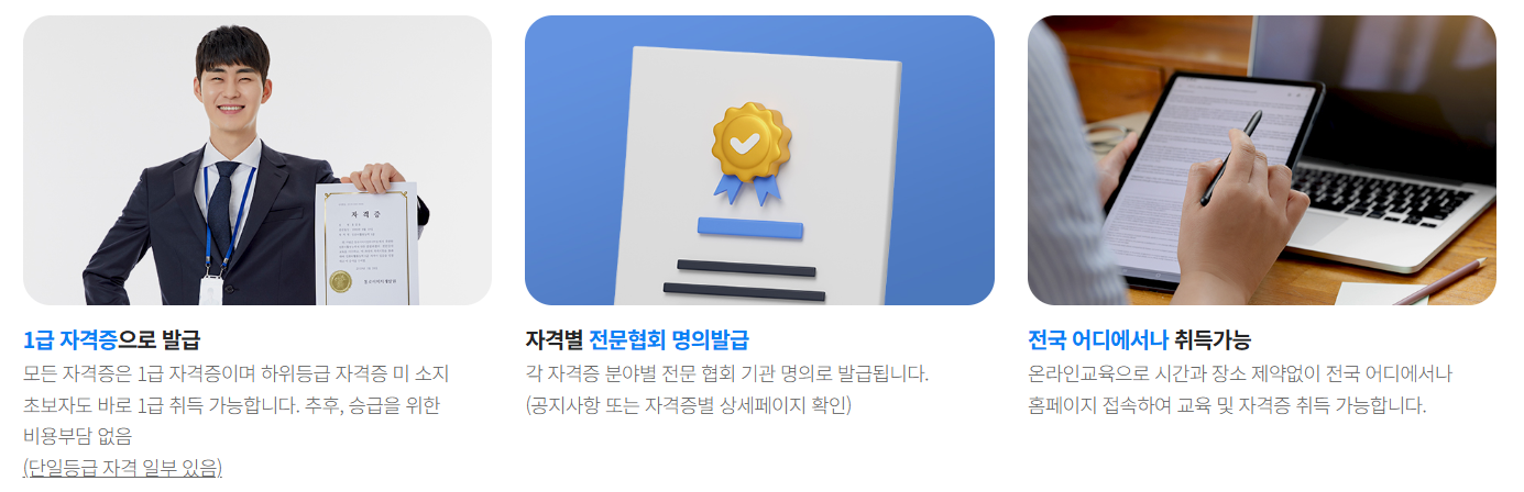 이 사이트에서는 컴퓨터 활용 능력, 전산회계, 스마트폰 활용, 면접 컨설턴트 등 실무 중심 과정부터 직무 관련 자격증 과정까지 폭넓게 제공합니다. 또한 정원관리사나 식음료관리사와 같은 직업 자격증도 온라인 강의와 시험을 통해 취득할 수 있도록 안내하고 있습니다.