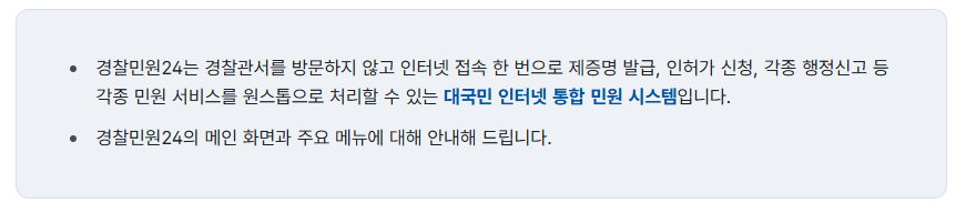 • 경찰민원24시 홈페이지는 경찰 관련 민원을 온라인으로 처리할 수 있는 통합 플랫폼입니다.