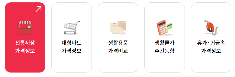 - 생활물가, 적산정보, 산업별 가격 등을 확인할 수 있습니다.