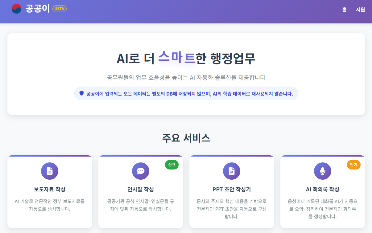 공공이 홈페이지는 공공행정 현장의 반복적인 문서 업무를 줄이고 새로운 가치 있는 일에 집중할 수 있도록 돕는 서비스입니다. AI 기술을 잘 활용하여 보다 스마트한 업무 환경을 만들어 보시기 바랍니다.