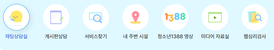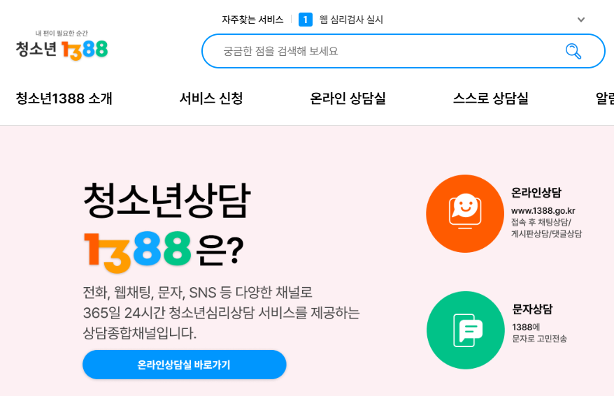 카카오톡, 인스타그램 등에서 ‘청소년상담1388’을 검색 후 메시지를 보내면 상담이 가능합니다. - 온라인 상담