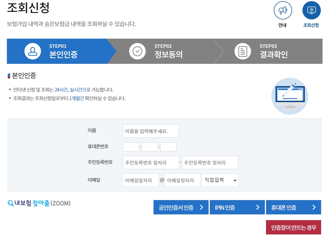 위에 제공해드리는 홈페이지 링크를 통해 바로 접속하셔서 휴먼보험금을 조회해보실 수 있는데요. 바로 본인 확인이 가능하며 본인인증을 통하여 확인가능합니다.