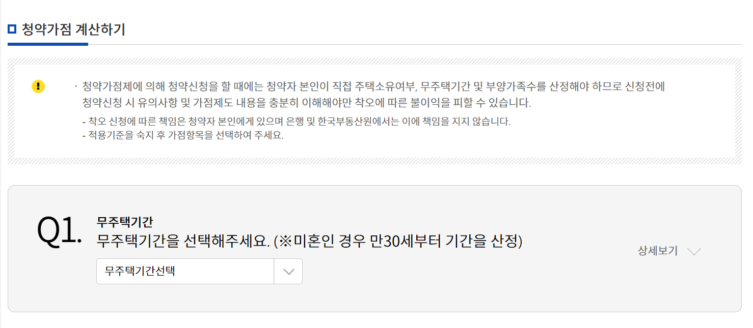청약가점제에 의해 청약신청을 할 때에는 청약자 본인이 직접 주택소유여부, 무주택기간 및 부양가족수를 산정해야 하므로 신청전에 청약신청 시 유의사항 및 가점제도 내용을 충분히 이해해야만 착오에 따른 불이익을 피할 수 있습니다.