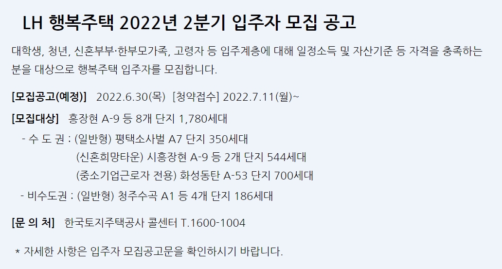 현재 LH 행복주택 2분기 입주자를 모집하고 있는데요. 대학생, 청년, 신혼부부, 한부모 가족, 고령자 등이 자격요건 충족시 행복주택입주가 가능하니 참고하세요. 청약접수는 2022년 7월 11일부터입니다. 총 1,780세대를 모집하고 있네요.