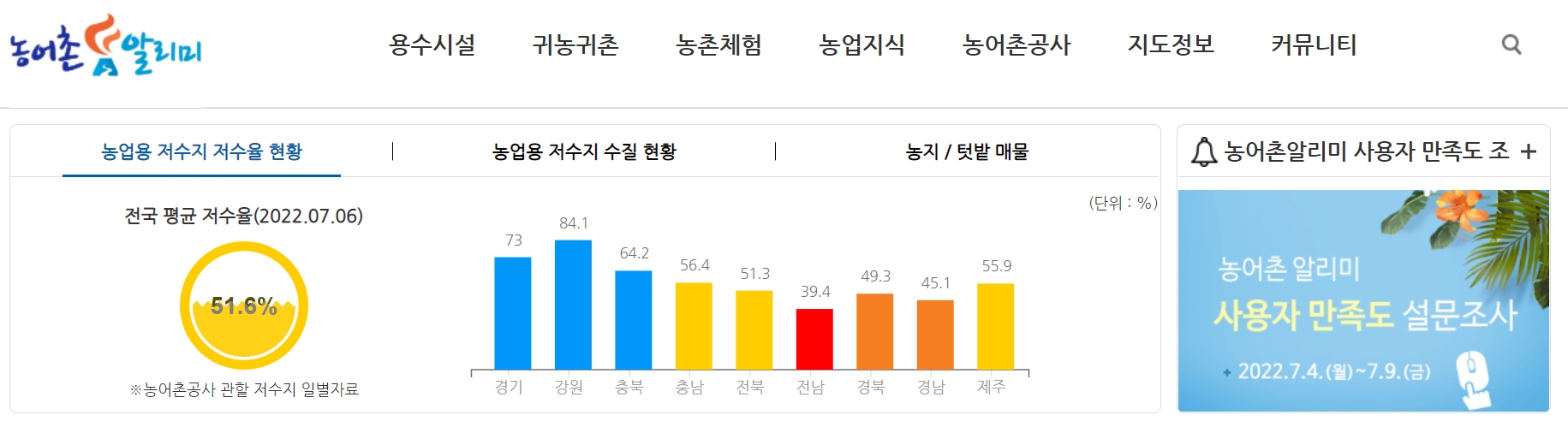 한국농어촌공사에서 운영하는 농어촌 정보 포털서비스로 저수지 저수율, 수질 등급, 안전진단, 농촌관광, 농촌주택표준설계도, 농지매물, 빈집매물 등의 정보를 제공합니다.