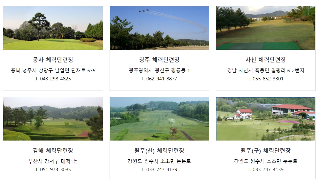 체력단련장은 공사, 광주, 사천, 김해, 원주, 수원, 대구, 성남, 예천, 청주, 강릉, 충주, 서산, 오산에 운영중입니다. 각 체력단련장별 운영정보 및 연락처는 공군복지포탈 사이트에서 바로 확인가능합니다.