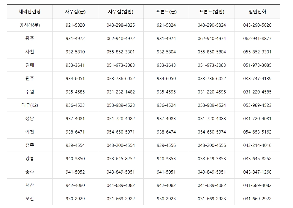 [체력단련장별 전화번호 안내]