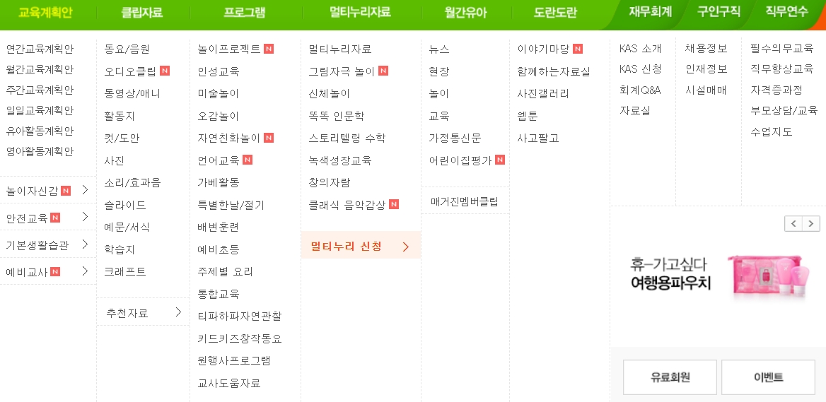 특히 어린 연령대의 아이들을 키우는 선생님이나 엄마들은 교육프로그램에 대해 공부하기 위하여 많이들 보시는 사이트인데요. 다양한 놀이 방법과 교육자료가 정말 방대하답니다. 어린이집 선생님들에겐 필수사이트라 할 수 있죠.