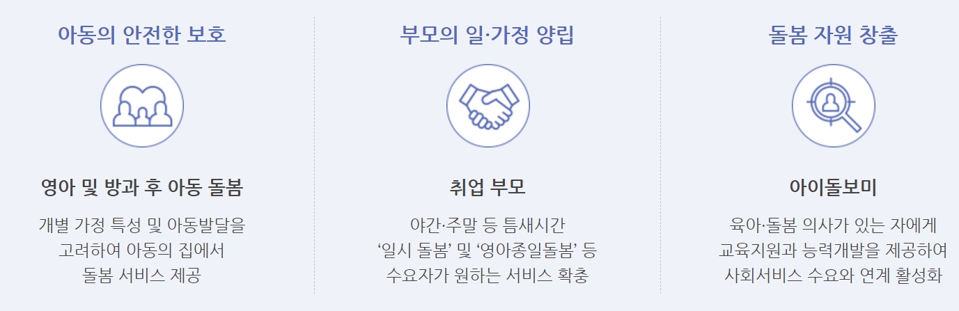 아이돌봄서비스 홈페이지에서는 부모의 맞벌이 등으로 양육공백이 발생한 가정의 만 12세 이하 아동을 대상으로 아이돌보미가 찾아가는 돌봄 서비스를 제공하여 부모의 양육부담을 경감하고 시설보육의 사각지대를 보완하기위한 아이돌봄 서비스를 제공하고 있습니다.