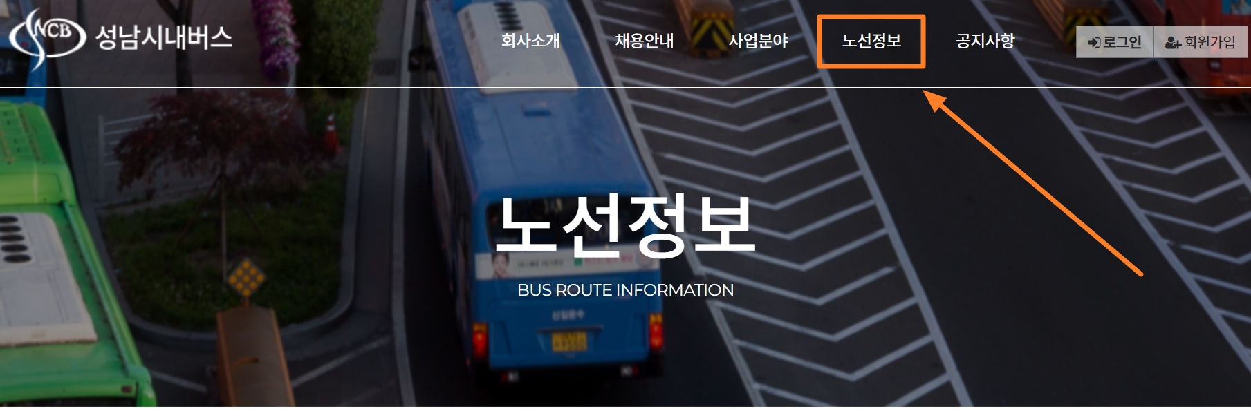 2. 제공해드린 링크를 통해 성남시내버스 사이트에 접속하시면 메인화면에 [노선정보]가 보이는데요. 여기를 클릭해주세요.