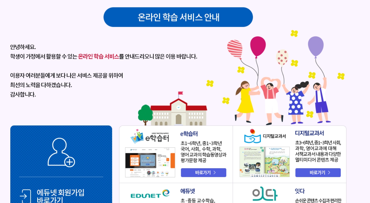 * 에듀넷은 한국교육학술정보원에서 운영하고 있는 교육 포털사이트로서 회원가입은 물론 모든 서비스를 무료로 제공하고 있습니다.