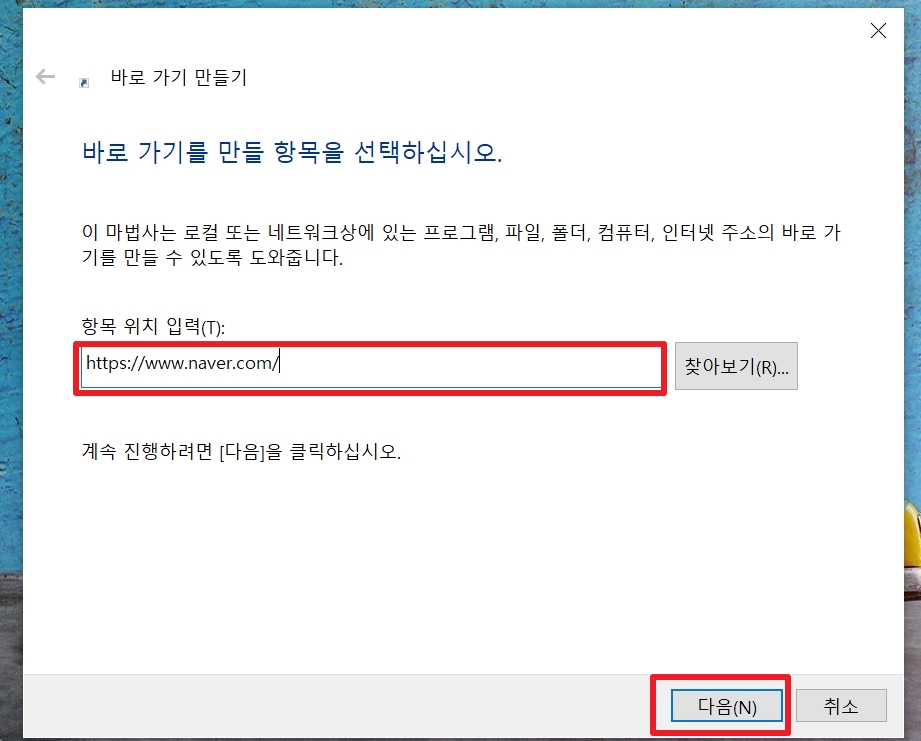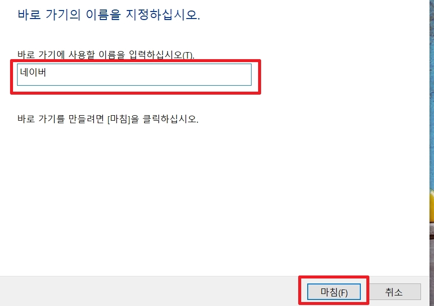 바로가기 이름을 [네이버]로 입력후 마침을 클릭하세요.