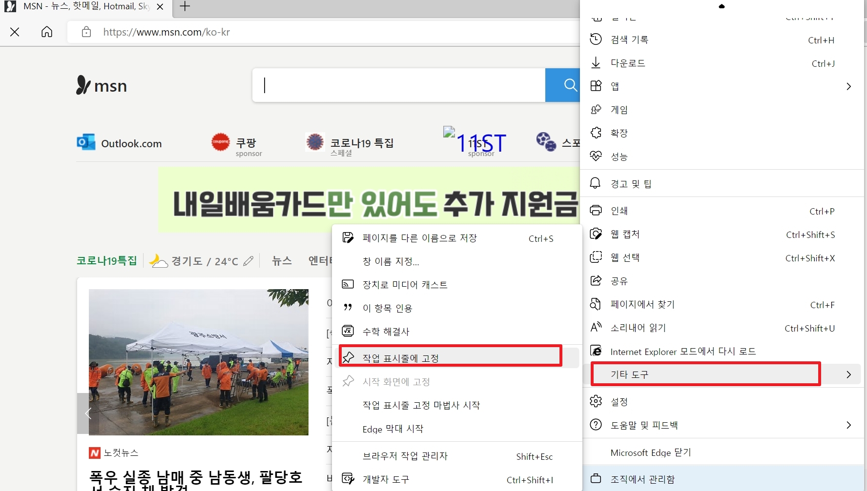때문에 조금 우회하는 방법을 사용해야 하는데요. 맨위 오른쪽의 점세개를 클릭하신후 기타도구 선택후 > 작업표시줄에 고정을 순서대로 클릭해주세요.
