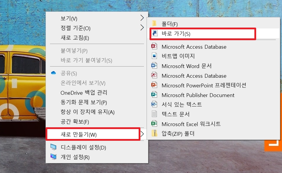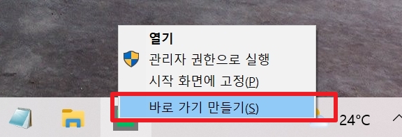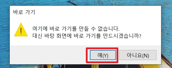 "여기에 바로가기를 만들수 없습니다. 대신 바탕화면에 바로가기를 만드시겠습니까?" 창이 나오면 [예]를 클릭해주세요.
