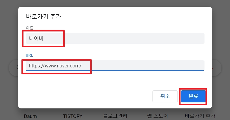 아래와 같이 바로가기 추가가 보이는데요. 이름에 네이버를 입력하시고, URL 칸에는 https://www.naver.com/ 를 입력해주세요.