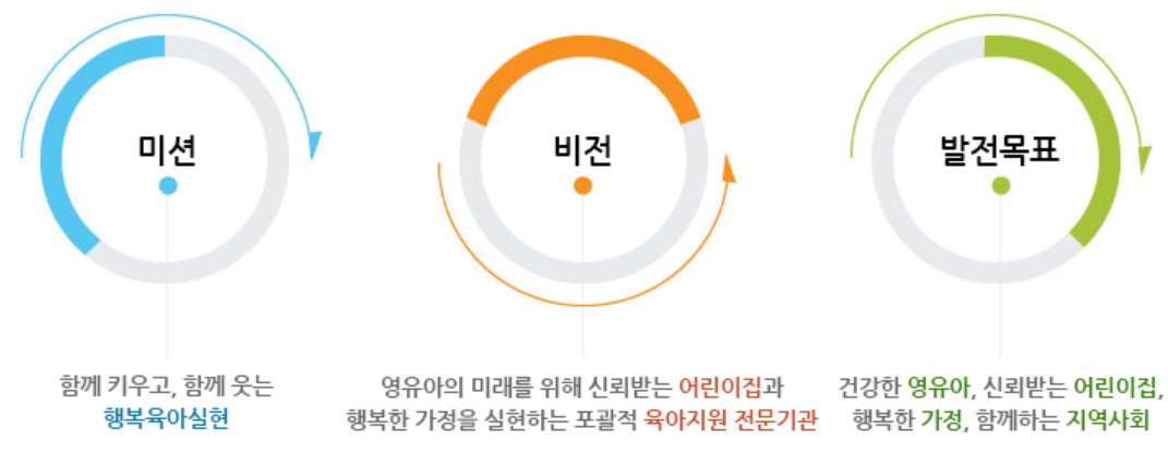 영유아의 미래를 위해 신뢰받은 어린이집과 행복한 가정의 영위를 위한 육아지원 전문기관으로서 영유아 중심 환경조성, 보육교직원 교육 및 전문성 향상 지원, 영유아 돌봄지원 등 양육문화 확산을 목적으로 하는 육아지원 전문기관입니다.