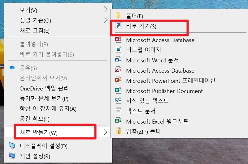 이번에는 보다 쉬운 접속을 위해 바탕화면에 바로가기 버튼을 만들어볼게요. 윈도우 바탕화면에서 마우스 오른쪽 버튼 클릭후 아래와 같이 새로 만들기 > 바로가기 를 순서대로 클릭해주세요.
