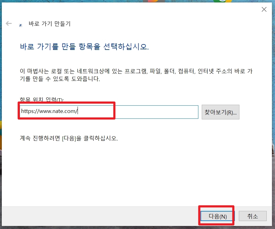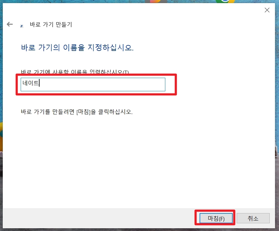 바로가기 이름을 [네이트]로 입력후 마침을 클릭하세요.