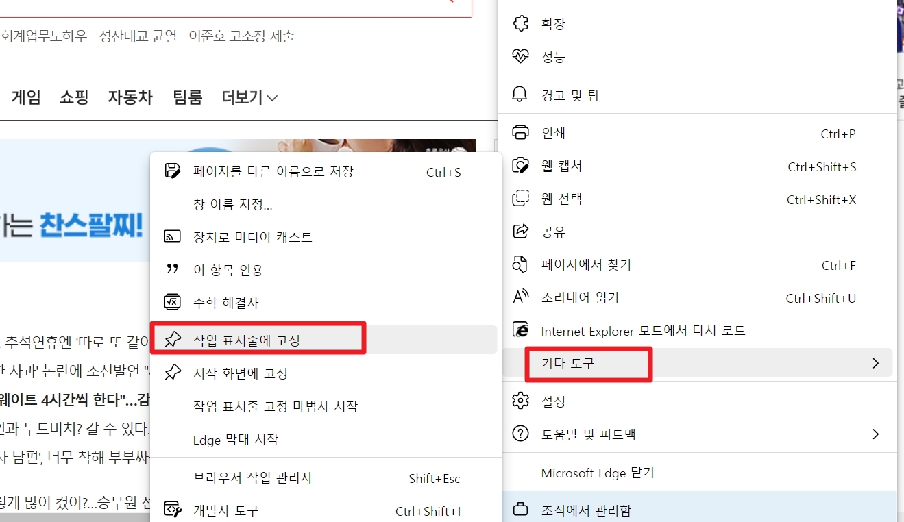 때문에 조금 우회하는 방법을 사용해야 하는데요. 네이트 메인화면에서 맨위 오른쪽의 점세개를 클릭하신후 기타도구 선택후 > 작업표시줄에 고정을 순서대로 클릭해주세요.