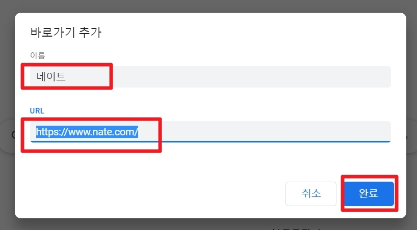 아래와 같이 바로가기 추가가 보이는데요. 이름에 네이트를 입력하시고, URL 칸에는 https://www.nate.com/를 입력해주세요.