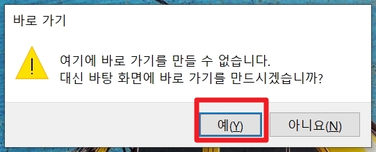"여기에 바로가기를 만들수 없습니다. 대신 바탕화면에 바로가기를 만드시겠습니까?" 창이 나오면 [예]를 클릭해주세요.