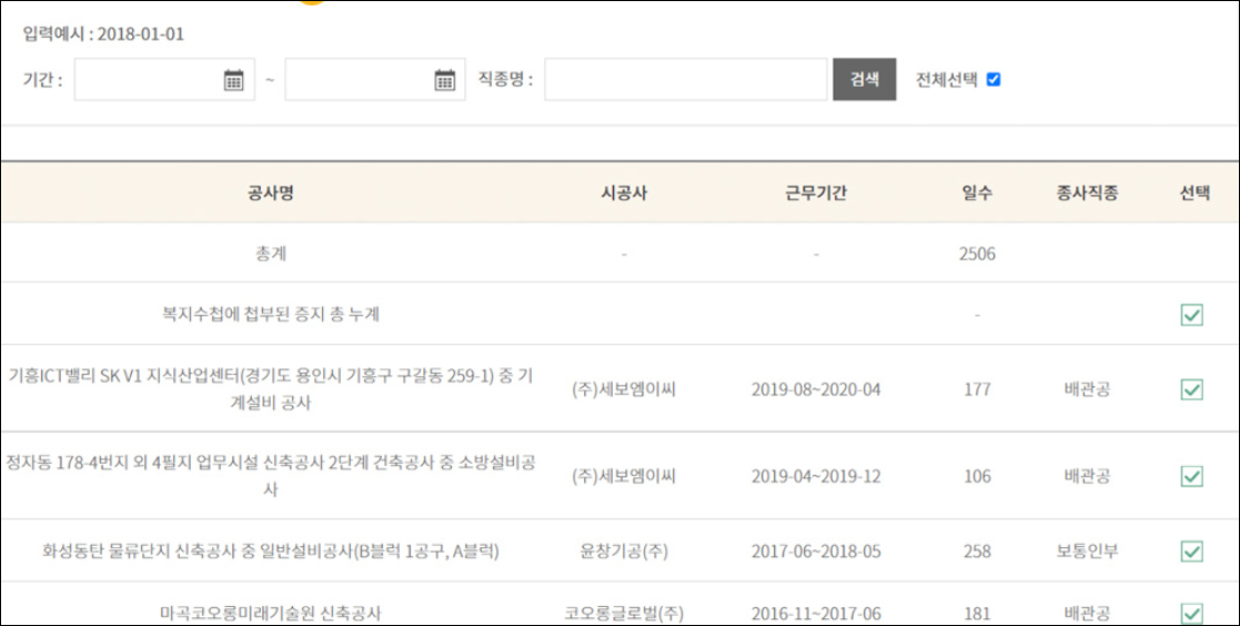 1) 근무경력 : 퇴직공제 및 고용보험 사업장별 근무경력