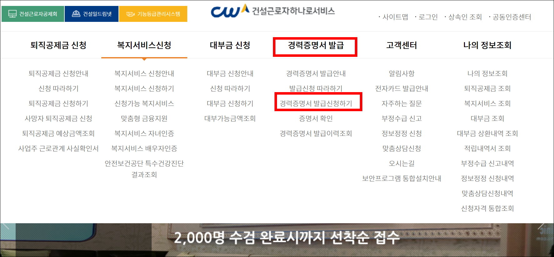 2) 메인화면 ▶ 경력증명서 발급 ▶ 경력증명서 발급신청하기
